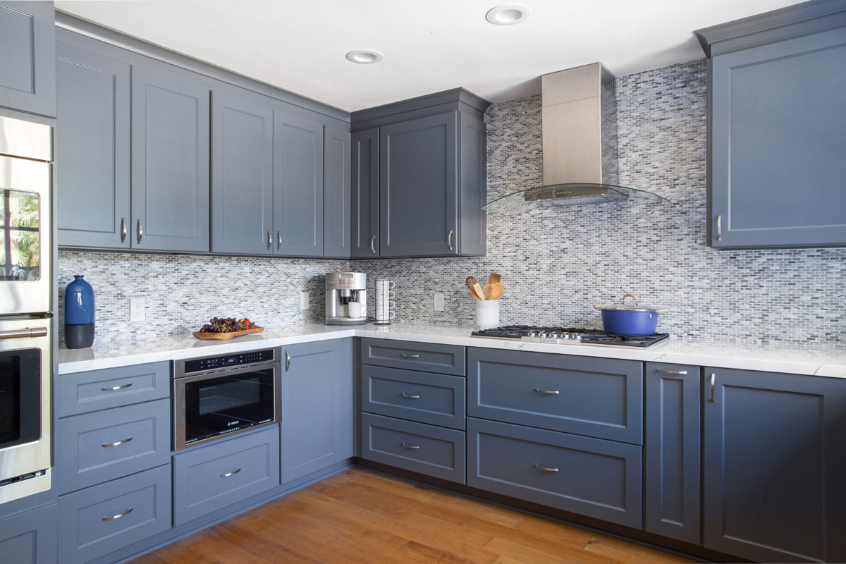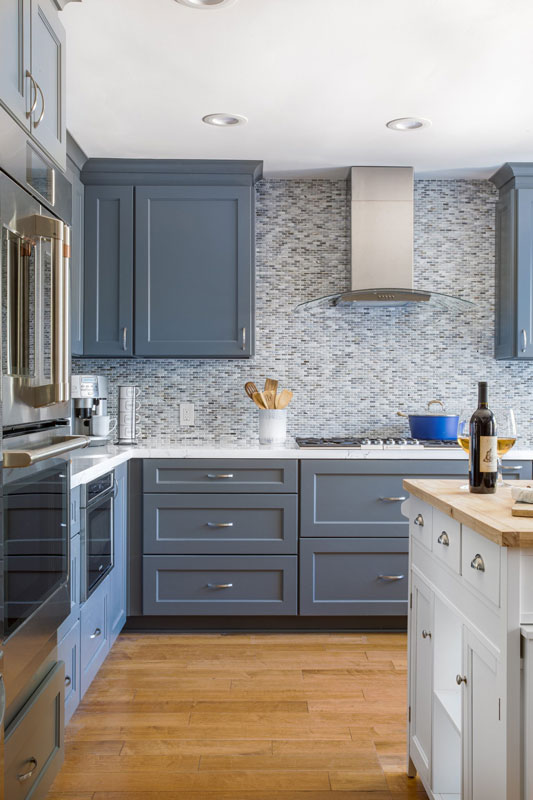 - Cabinets – Shaker style maple doors/drawers in blue painted finish/ 2 blind corner pullouts, spice pullouts, recycling center