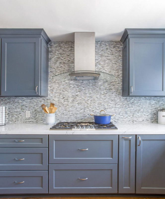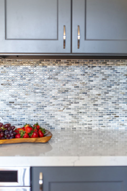 - Backsplash – Mult-toned blue & gray tones in a mini-offset mosaic pattern