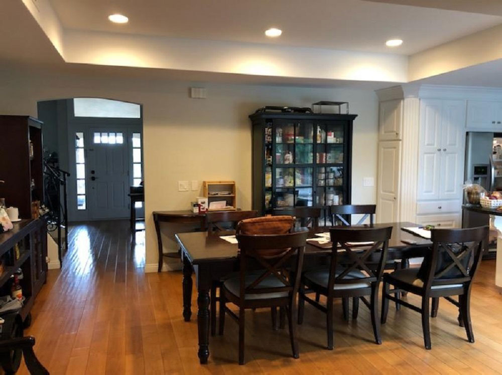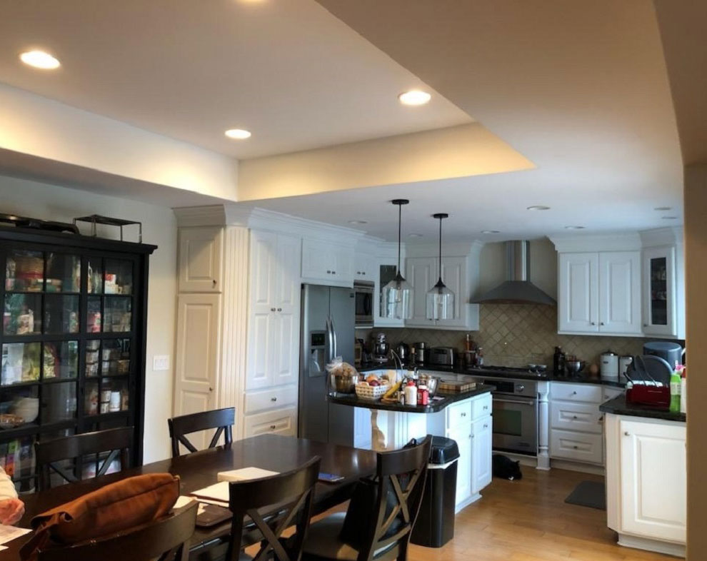 Interesting Features: Our client wanted to maximize storage and incorporate her Dining Table – we were to do both by creating a space that gave her the storage she needed with a pair of 30” Pantries with rollouts, pair of blind corner pullout base cabinets and still leave room for a large table that seats 8-10..