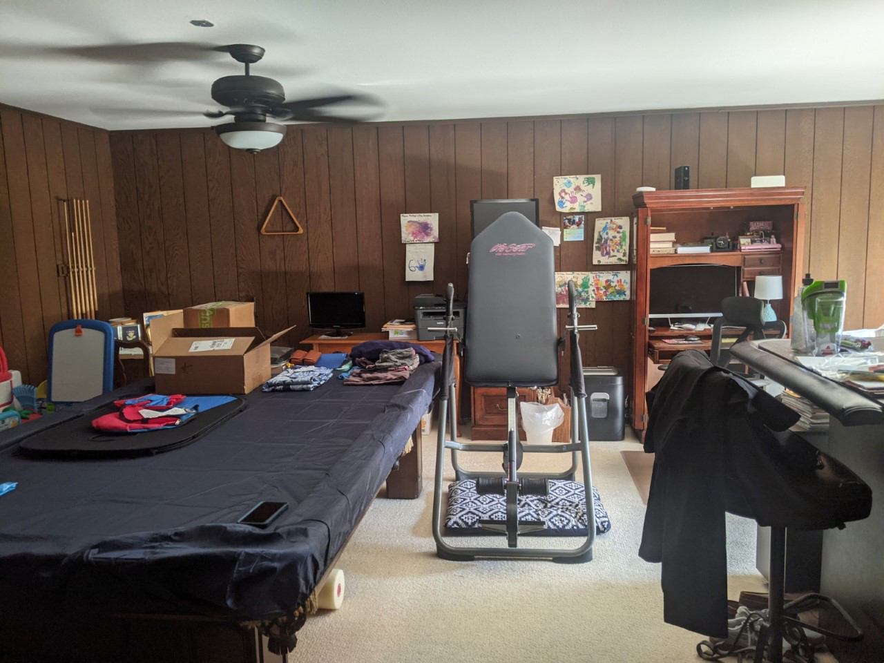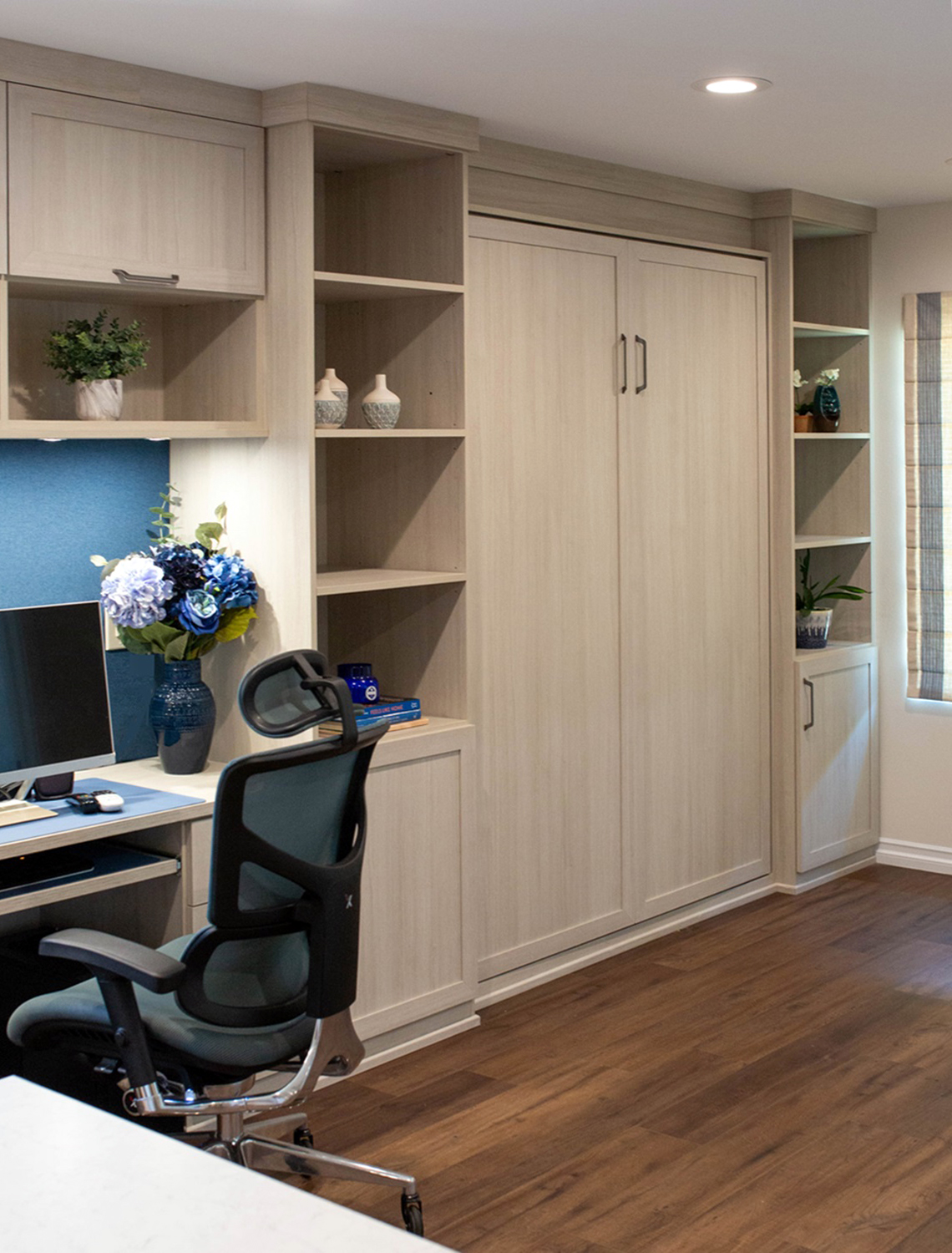 - Husband wanted a space designated as his “Office” which consisted of desk area with storage including a cabinet with a pullout shelf for his printer.