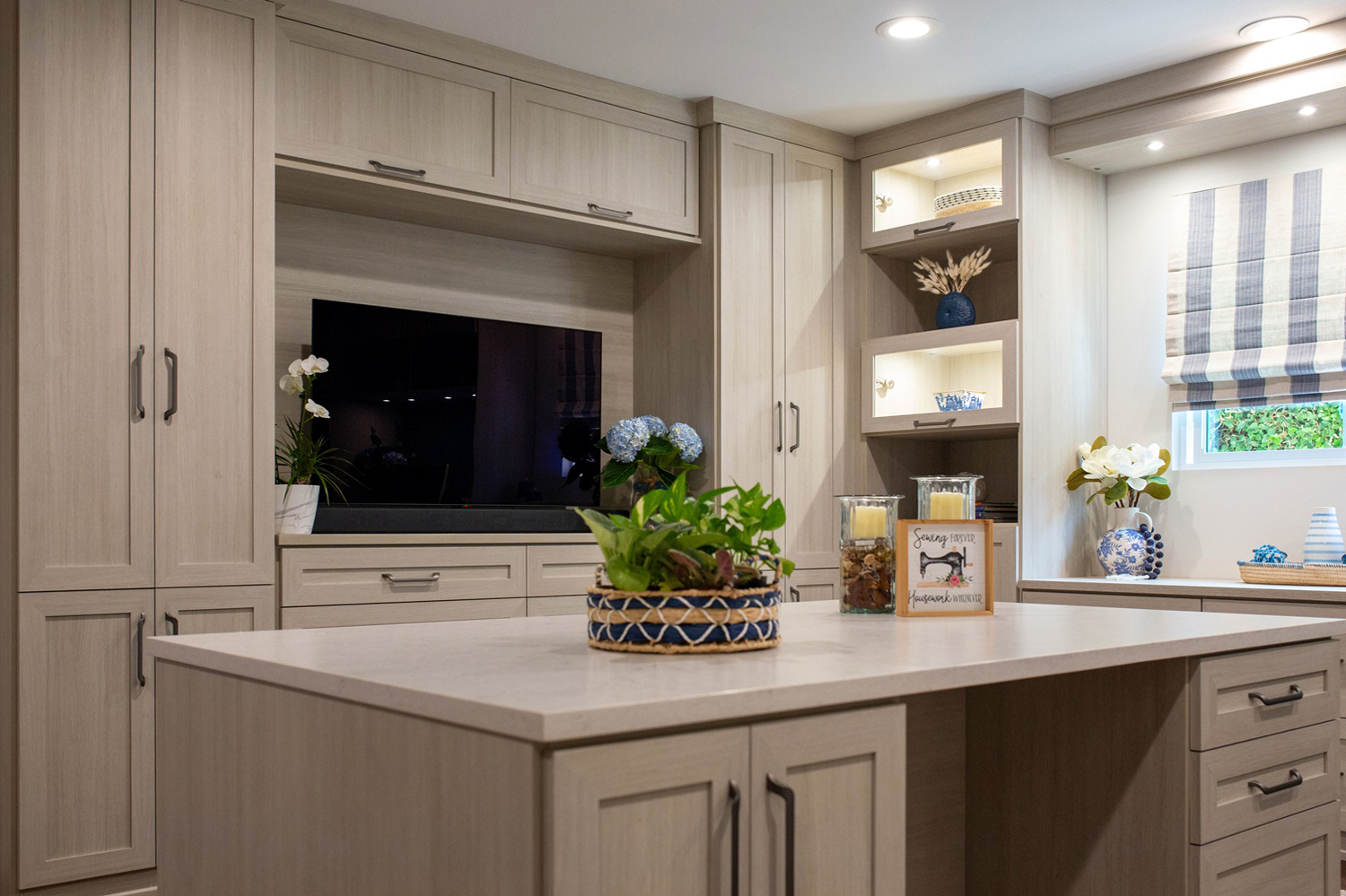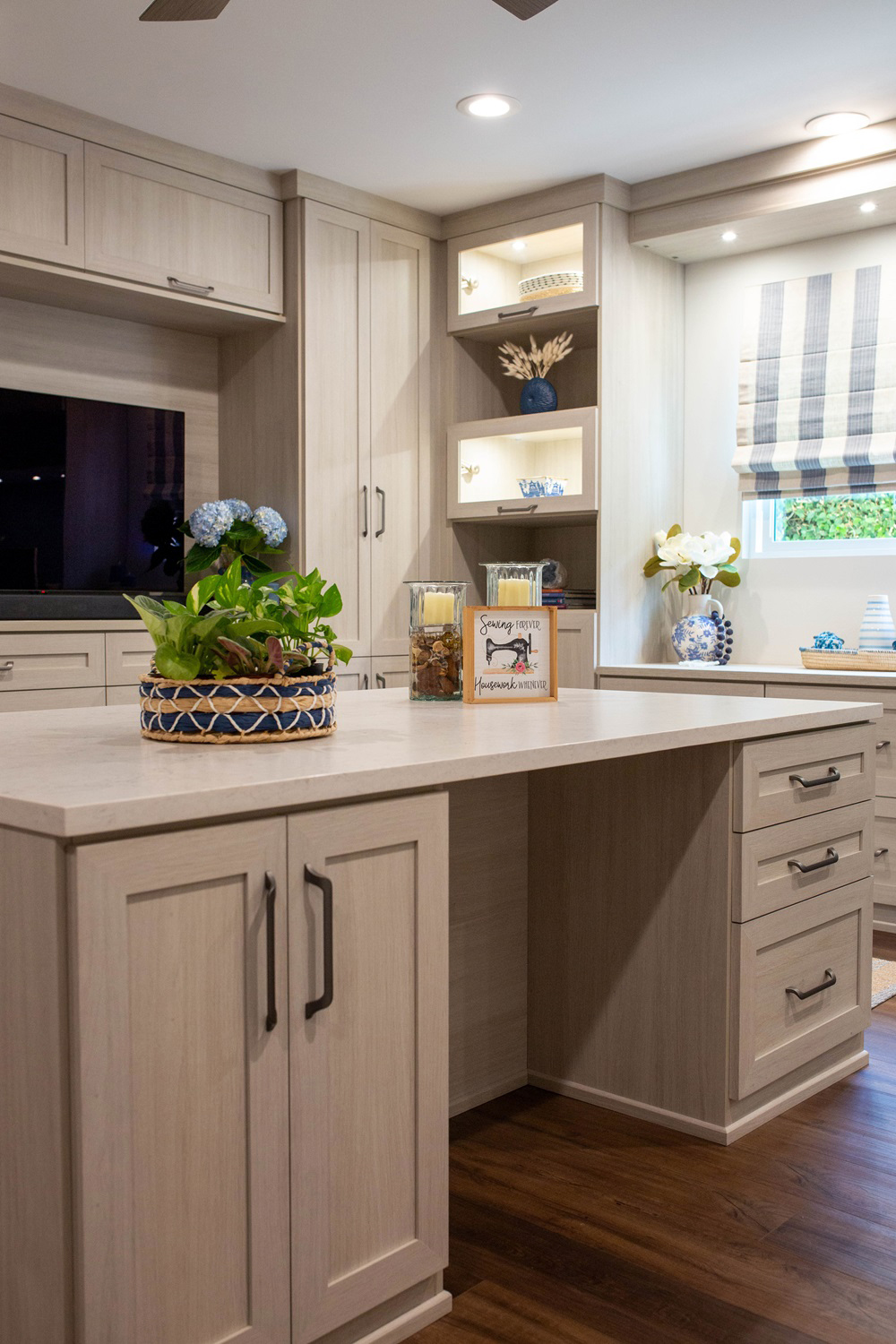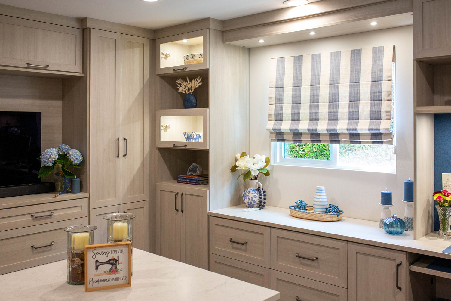 - Wife is an avid seamstress and wanted a dedicated space for her projects. We opted to provide just that with plenty of storage space and a pull-out appliance unit to house her sewing machine along with a pullout for her sewing essentials.