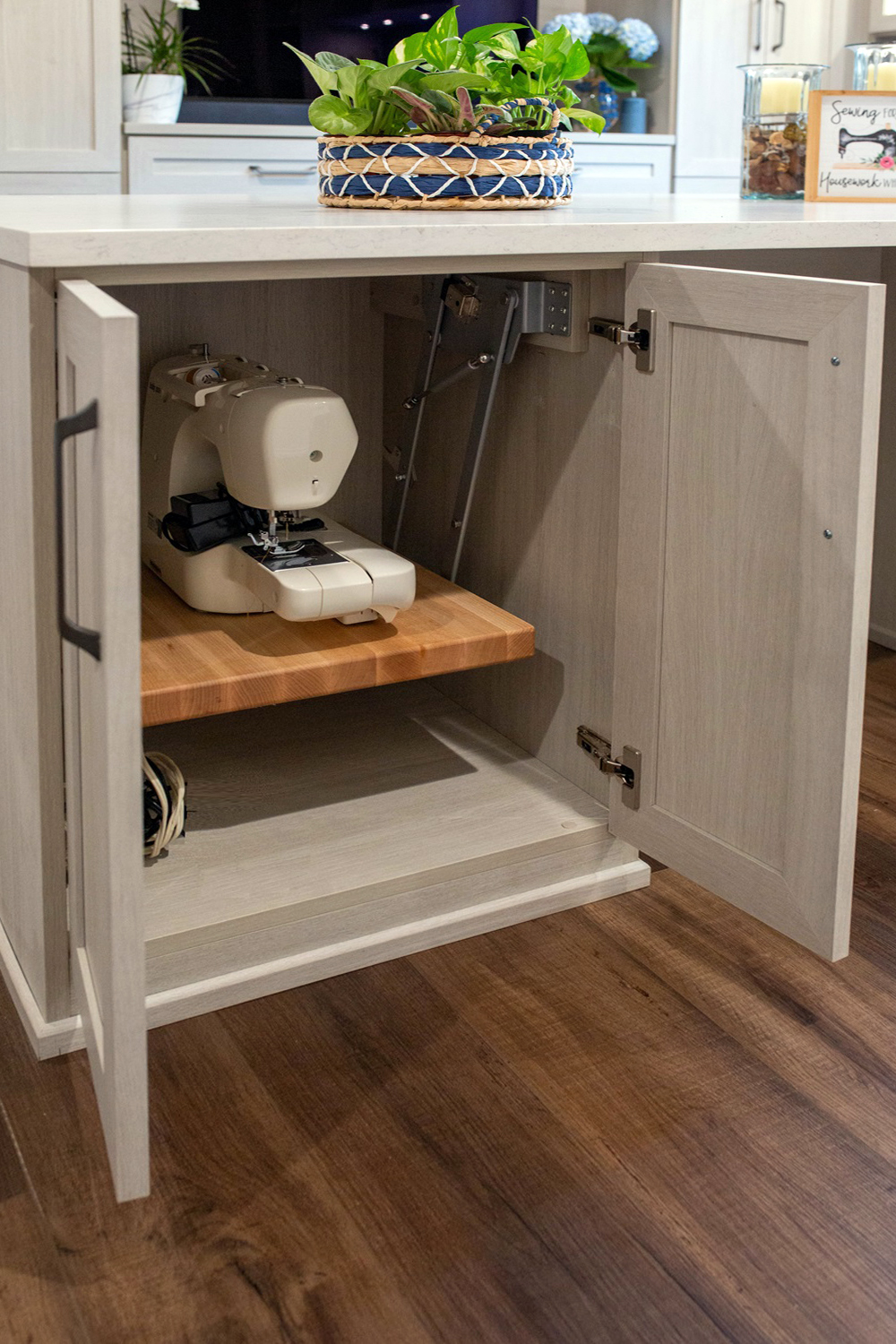 - Sewing center- Soft close appliance lift repurposed for sewing machine