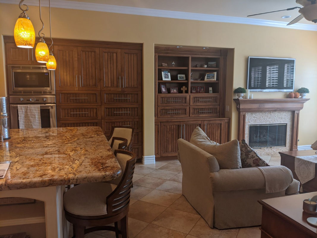 Problems Solved: Clients wanted to keep most of the Kitchen cabinets but update the space with a light and airy feeling to complement the rest of the home. A section of wall cabinets next to the fireplace was modified to create a dry bar. The cabinets were painted in a coastal blue tone along with the island, and all countertops changed out to quartz. White subway tiled backsplashes complementing the countertops helped create the coastal vibe they were looking for.