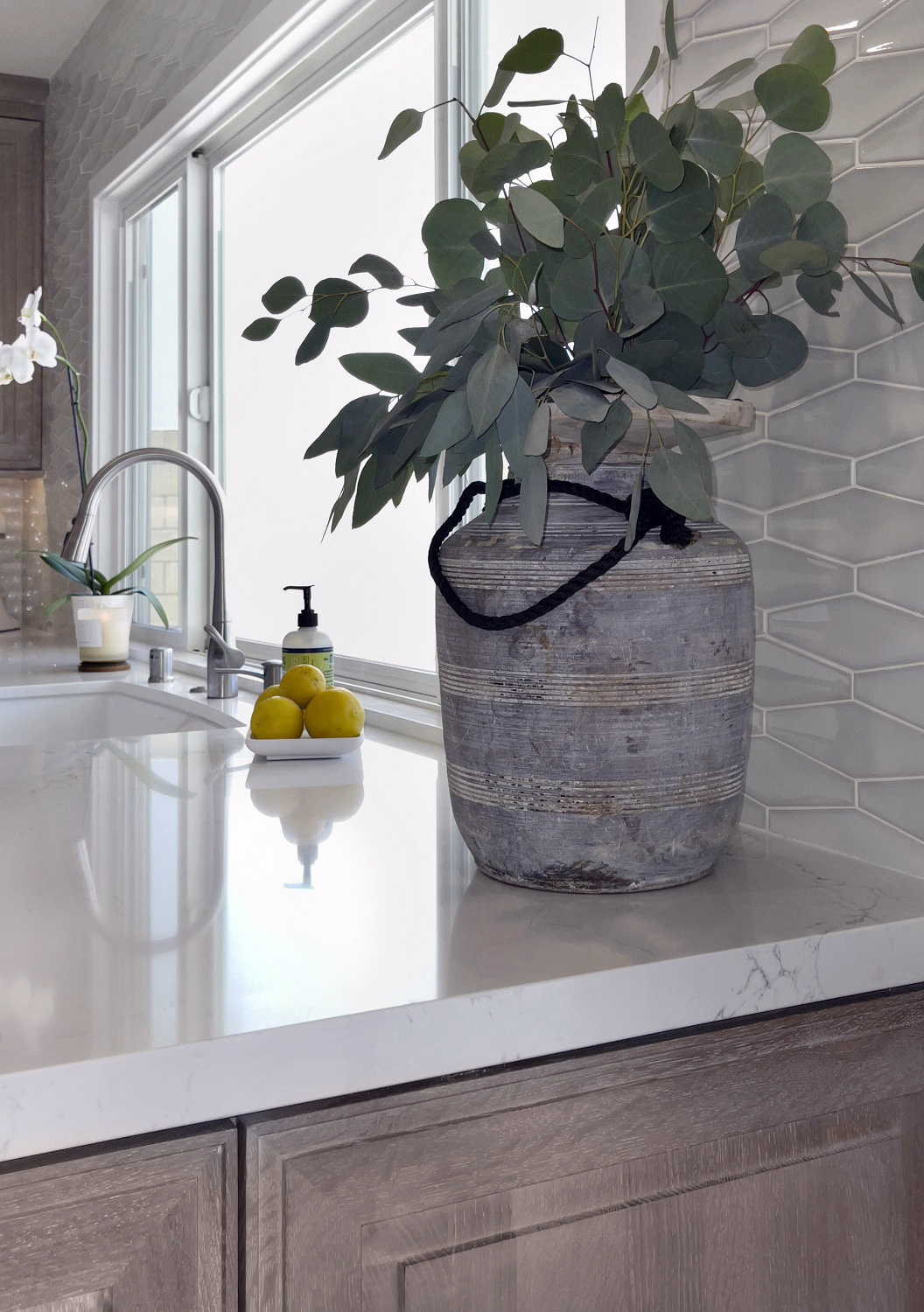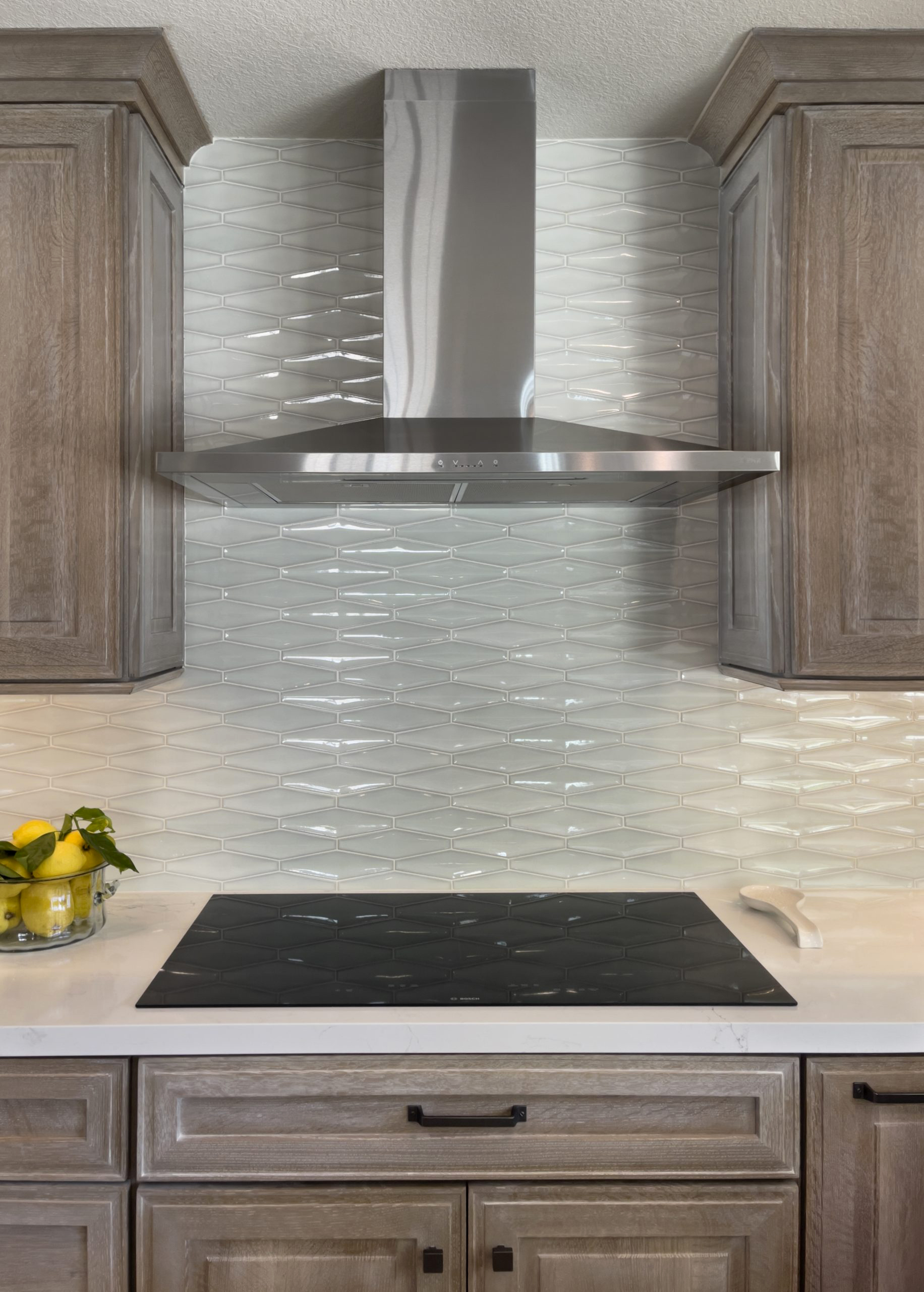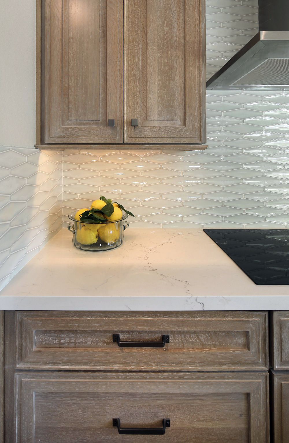 - Backsplash – Elongated hexagon porcelain tiles in variations of “Frost” finish