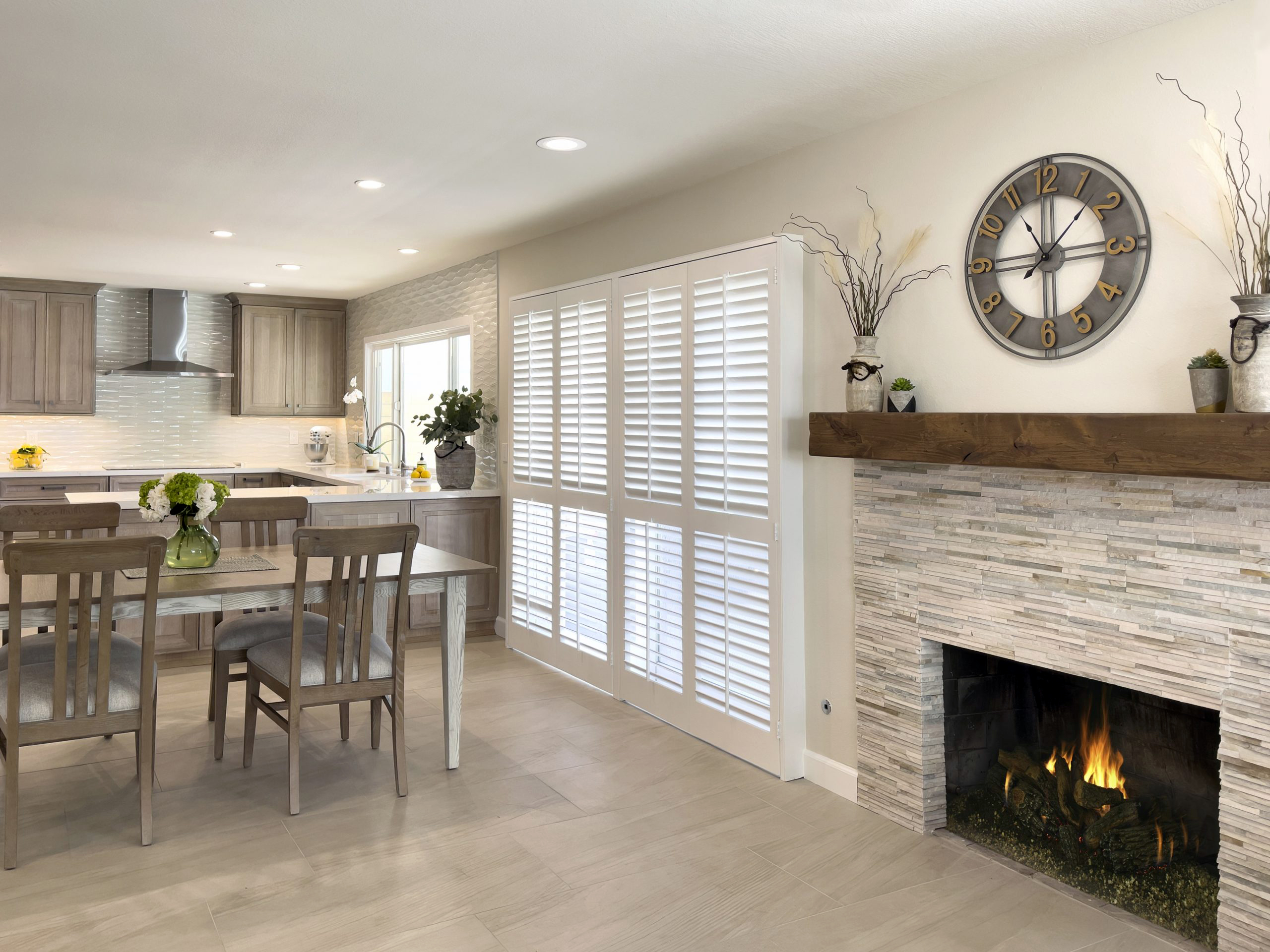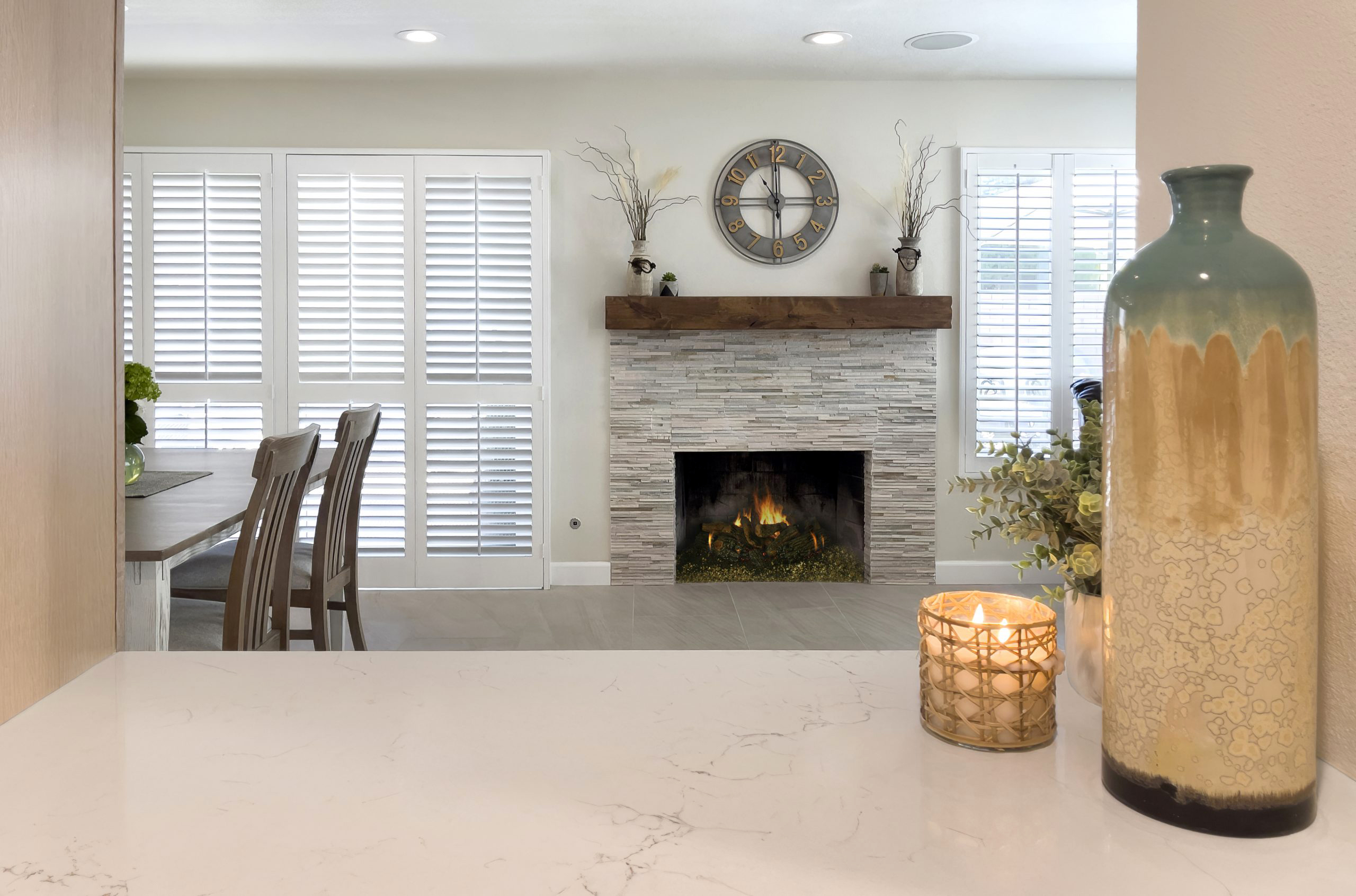 Color Scheme: The warm, earthy tones with subtle light sea-green tile in the Kitchen and multi-toned neutrals on fireplace surround