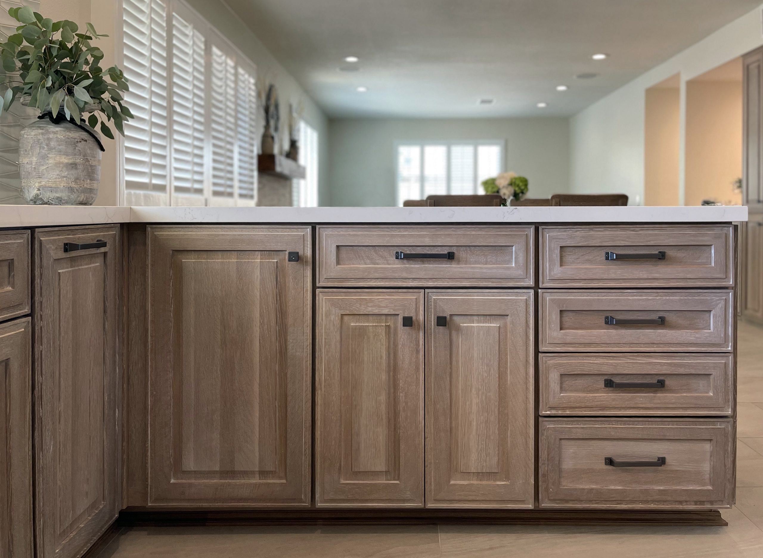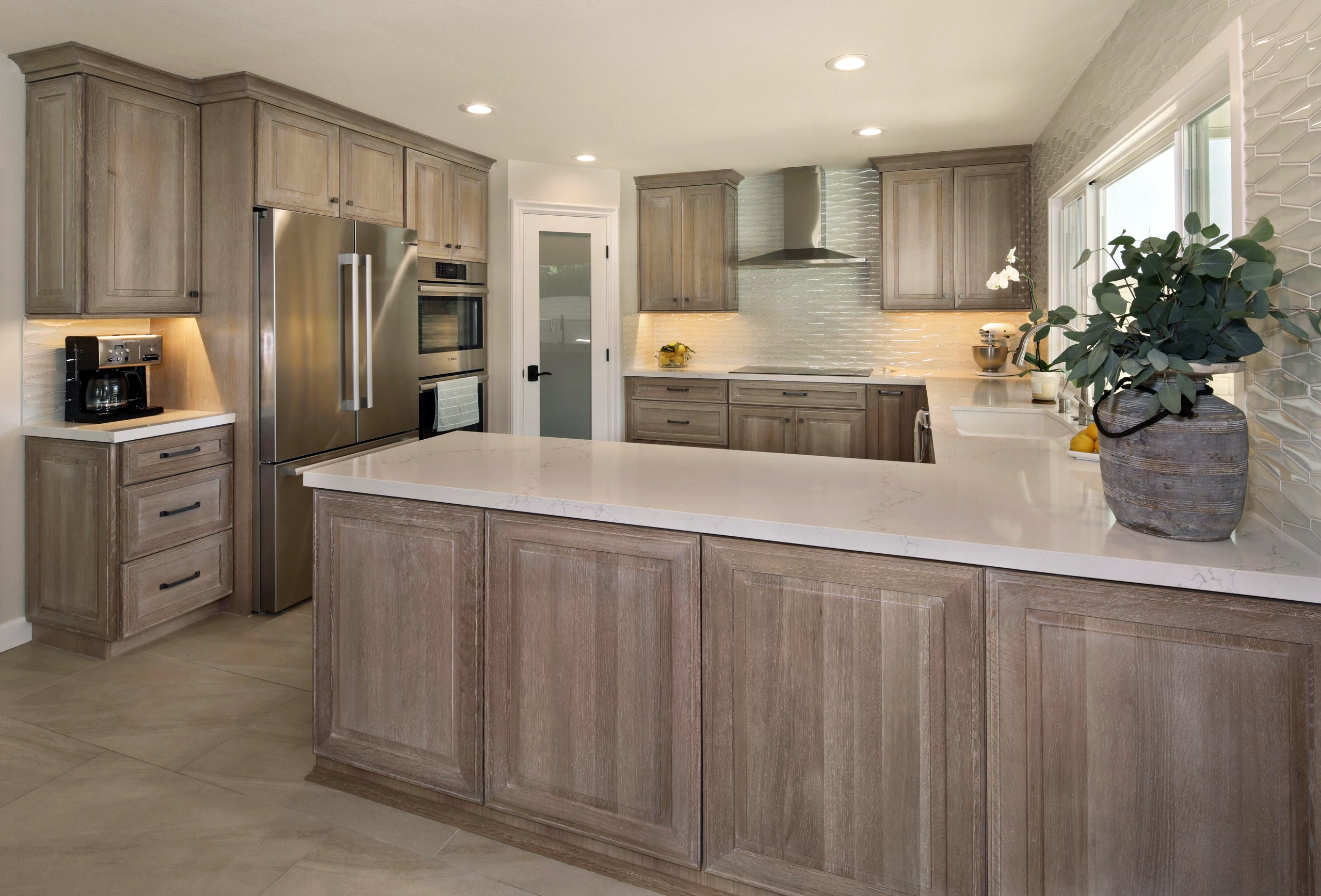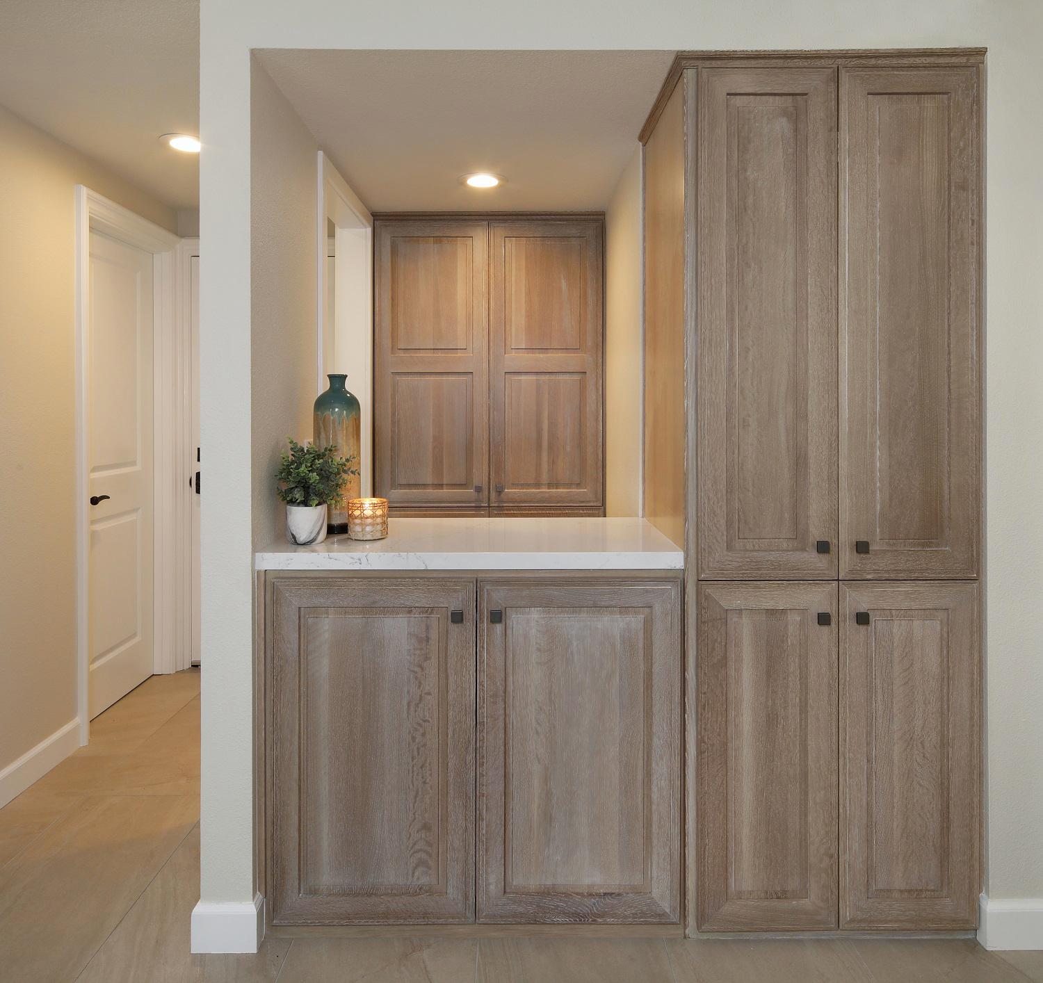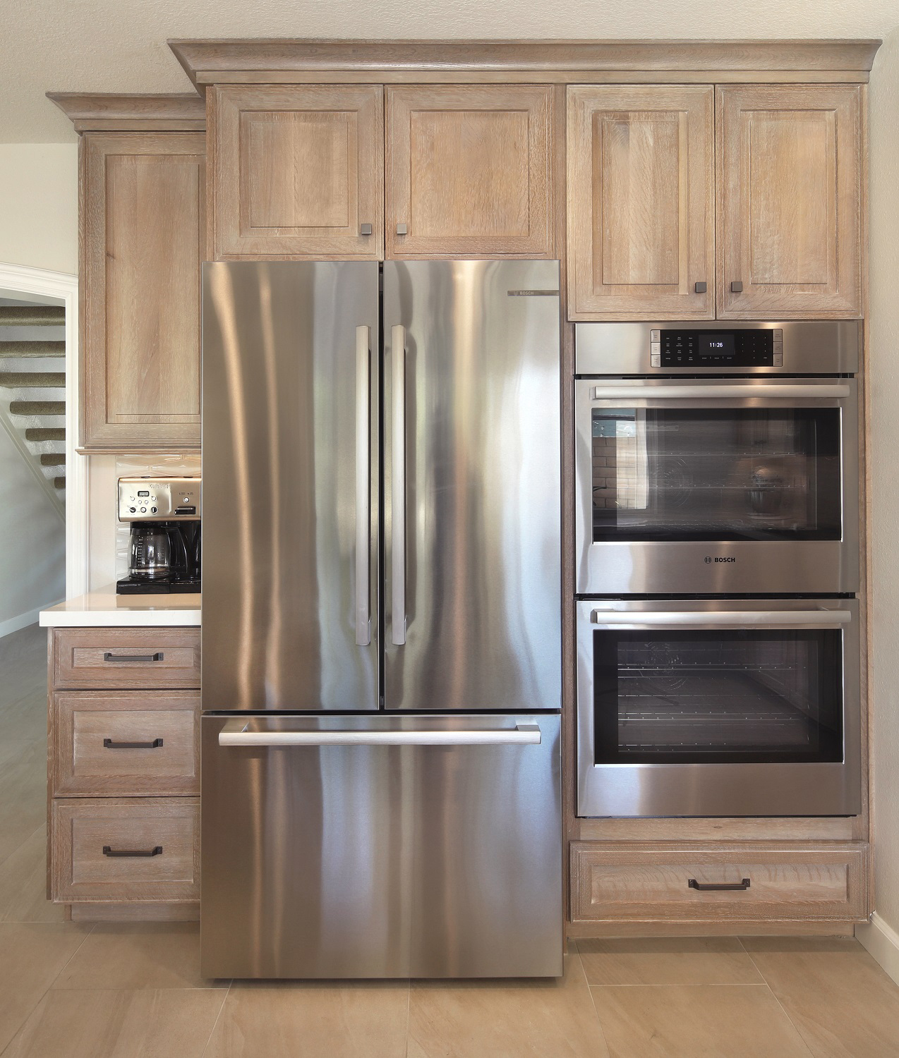 - Cabinets – Shaker styled cabinets in quarter sawn oak, finished in a Ceruse Natural stain and coved crown molding