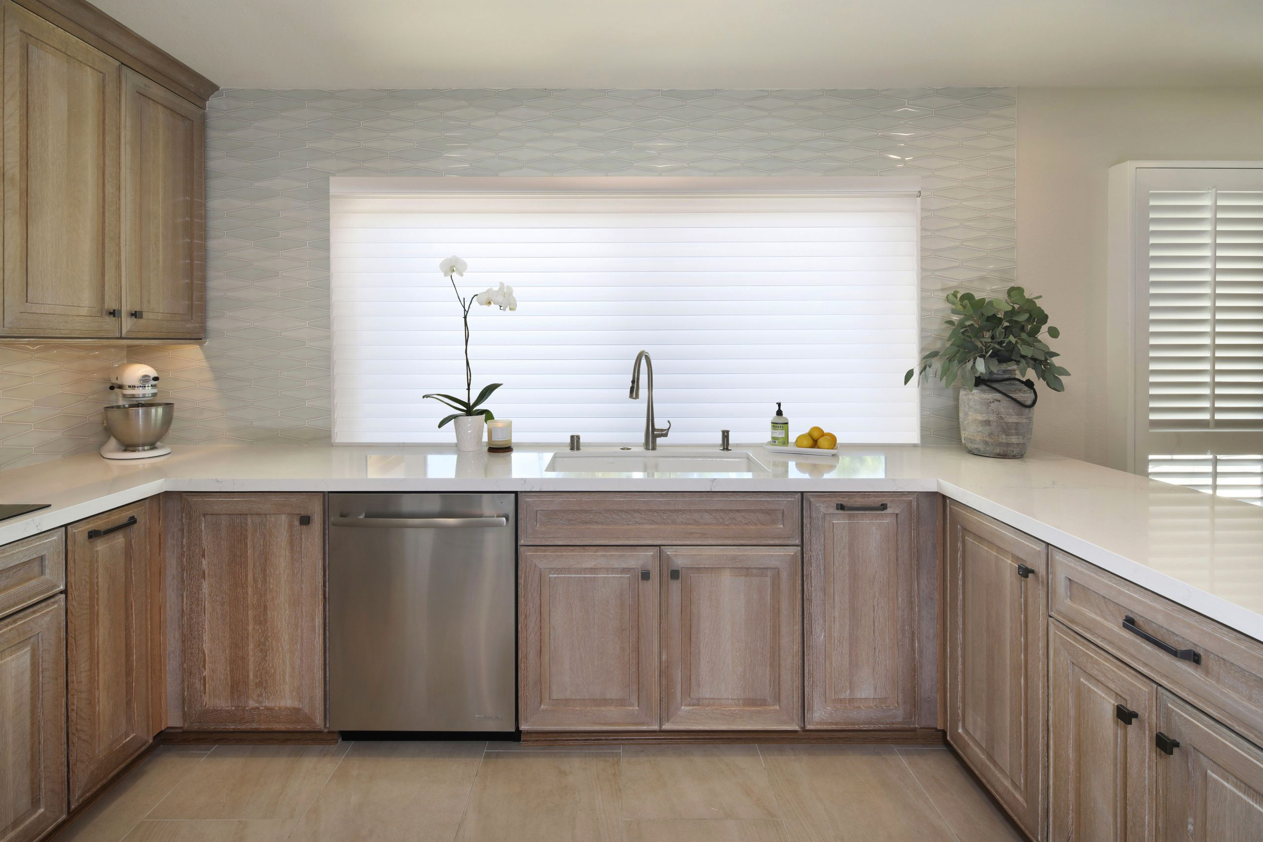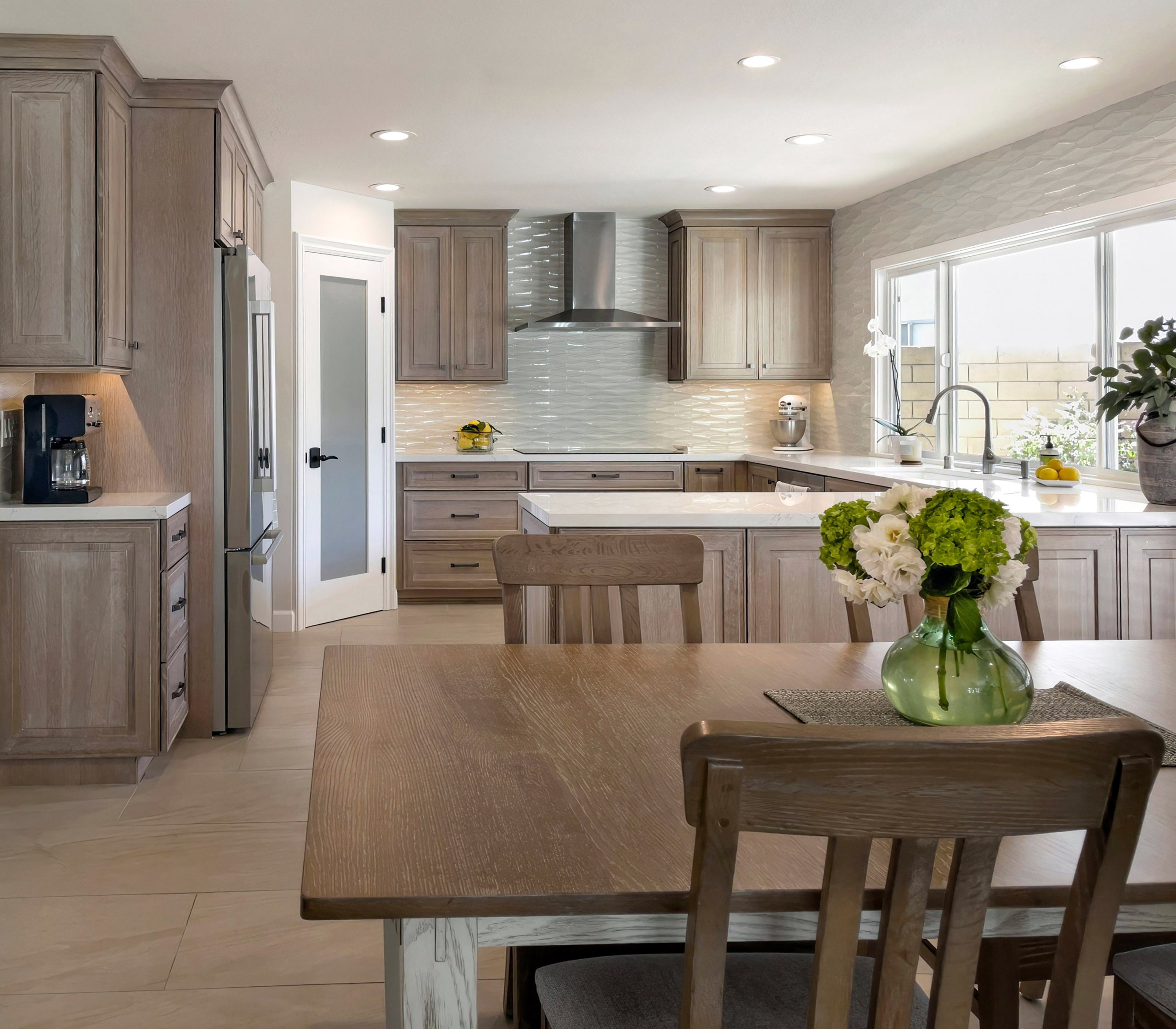 - Kitchen Flooring – 18” x 36” porcelain matte tile in a warm beige travertine style