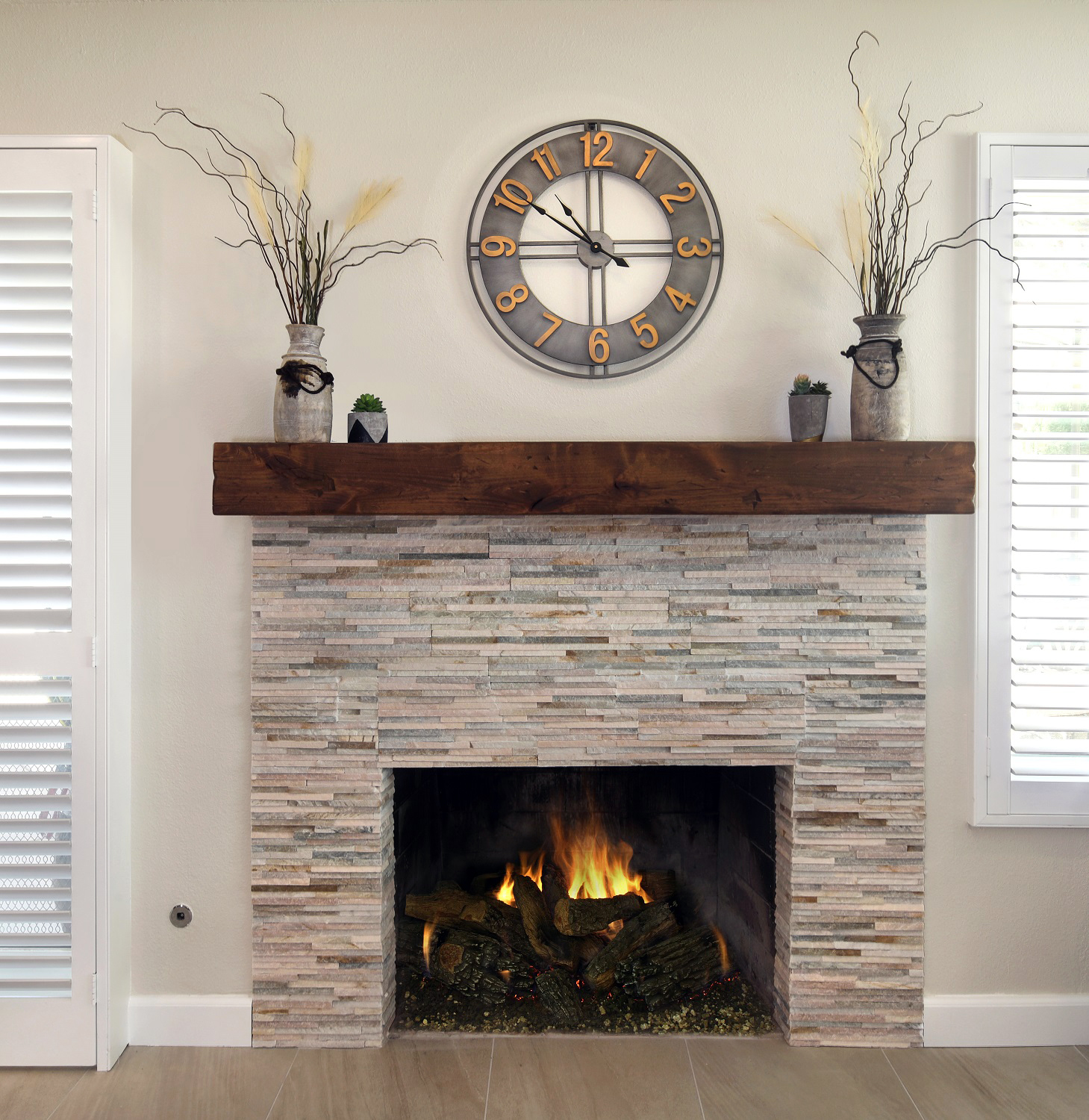 - Fireplace Mantel – distressed alder wood in walnut tone