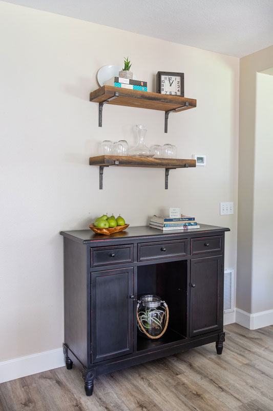 Floating shelves for wine kit above sideboard