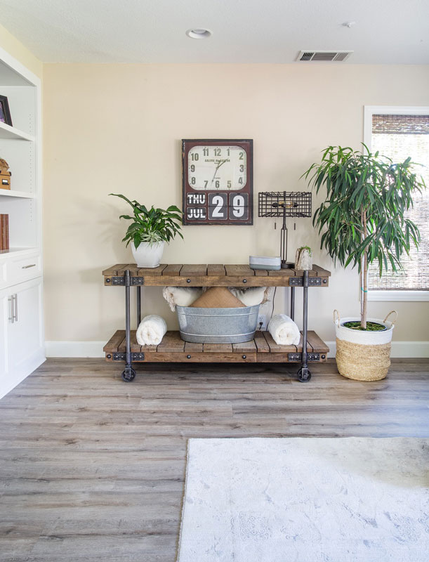 Farm cart can be easily rolled away from shelves & storage cabinets for ease of access