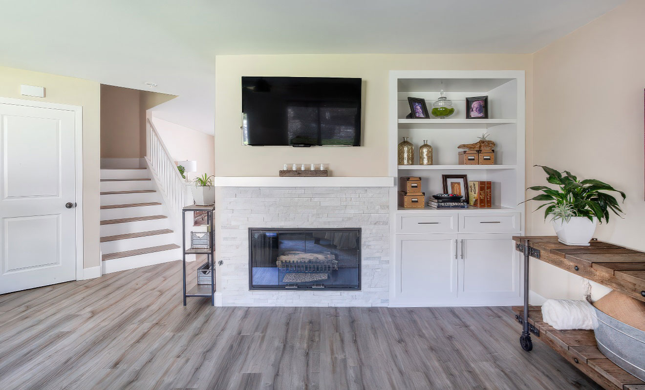 Glass-enclosed gas log fireplace completes the room